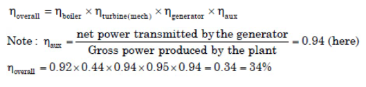 A steam plant has the boiler efficiency of 92%, turbine efficiency (mechanical) of 94%, generator efficiency of 95% and cycle efficiency of44%. If 6% of the generated power is used to run the auxiliaries, the overallplant efficiency is