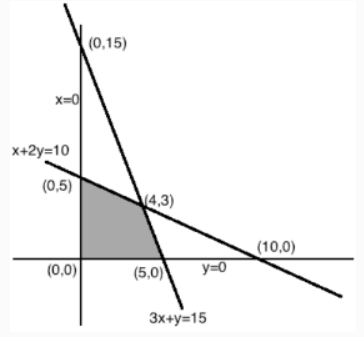\(\begin{array}{lc}\text { Corner points } & \mathrm{Z}=3 \mathrm{x}+2 \mathrm{y} \\ (0,0) & 0 \\ (5,0) & 15 \\ (0,5) & 10 \\ (4,3) & 18\end{array}\)