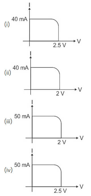 In a solar cell, the maximum power obtained when sun light is illuminated on it is 65 mW. The fill factor of the solar cell is 0.65. Which of the following I-V characteristics will represent the above solar cell?