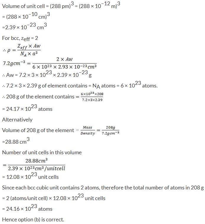 An element has a bcc structure with a cell edge of 288 pm. The density of the element is 7.2 g cm–3. Number of atoms present in 208 g of the element ?
