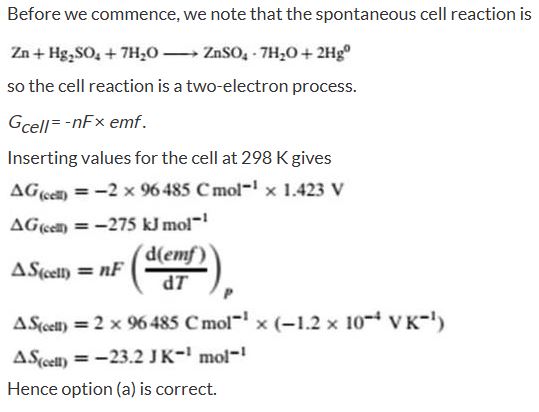 The Clark cell Zn|Zn2+// Hg2SO4|Hg is often employed as a standard cell since its emf is known exactly as a function of temperature. The cell emf is 1.423 V at 298 K and its temperature coefficient of voltage is -1.2 × 10-4 V K-1. What is ΔScell at 298 K?
