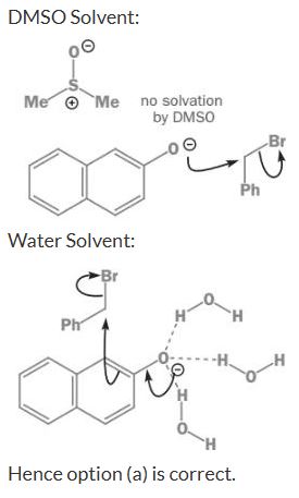 In water the product is almost all benzyl naphthol. However, in DMSO (dimethyl sulfoxide) the major product is the ether. In water the oxyanion is heavily solvated through hydrogen bonds to water molecules and the electrophile cannot push them aside to get close to O– (this is an entropy effect). DMSO cannot form hydrogen bonds as it has no OH bonds and does not solvate the oxyanion, which is free to attack the electrophile.