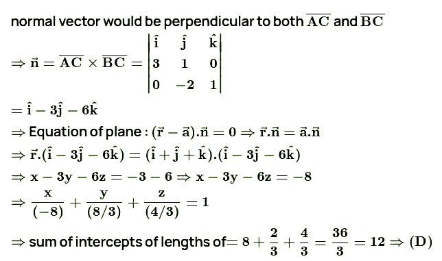 The plane passing through the point (−2, −2, 2) and containing the line joining the points (1, 1, 1) and (1, −1, 2) makes intercepts on the coordinates axes then sum of the lengths of intercepts is