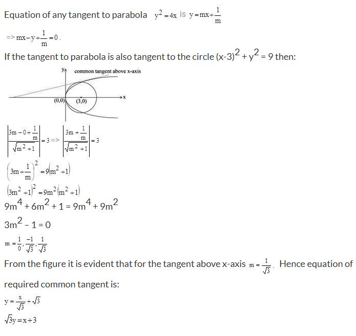 The equation of the common tangent touching the circle (x-3)2 + y2 = 9 and the parabola y2 = 4x above the x-axis, is
