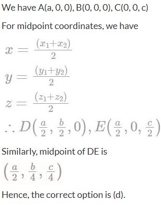 The plane  meets the coordinate axes at A, B, C respectively. D and E are the mid-points of AB and AC respectively. Coordinates of the mid-point of DE are?