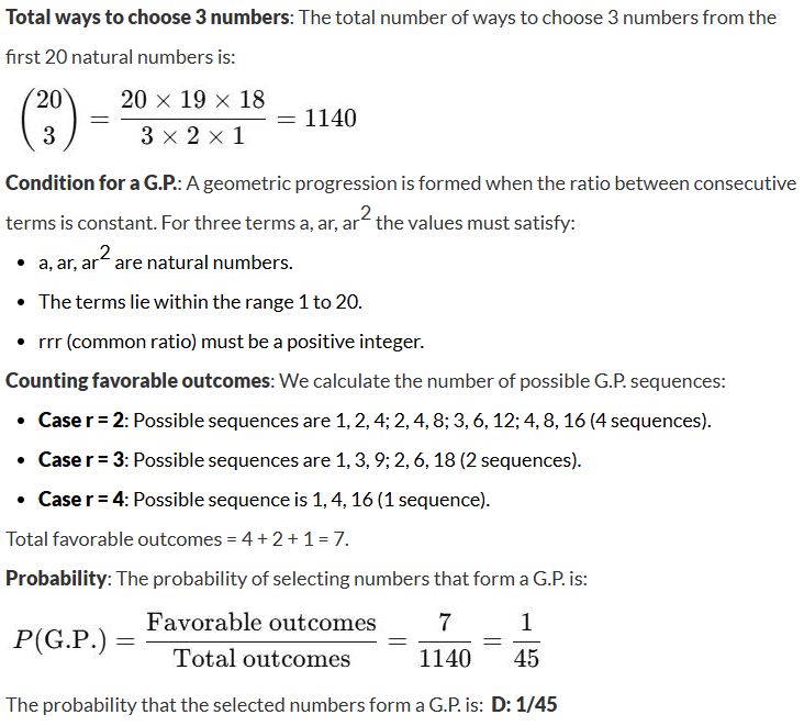 Three numbers are chosen at random from the first 20 natural numbers. The probability that the selected numbers form a G.P. is