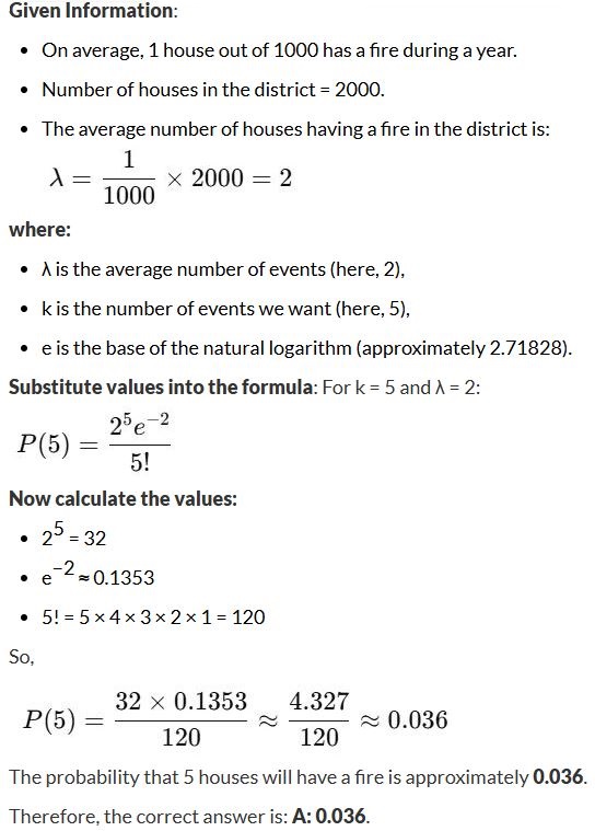 Past records show that on an average, 1 house out of 1000 in a certain district has a fire during a year. If there are 2000 houses in that district, the probability that 5 houses will have a fire is