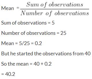Alex is taking readings of an experiment. He calculated the algebraic sum of deviation of 25 observations which were measured from 40 was found out to be 5. What is the mean of the readings?