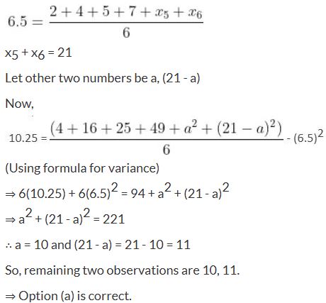 The mean of 6 distinct observations is 6.5 and their variance is 10.25. If 4 out of 6 observations are 2, 4, 5 and 7, then the remaining two observations are: