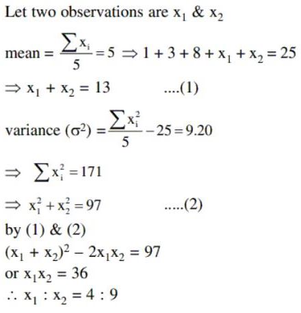 The mean of five observations is 5 and their variance is 9.20. If three of the given five observations are 1, 3 and 8, then a ratio of other two observations is: