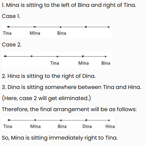 Five fisherwomen Bina, Hina, Mina, Tina and Dina are sitting in a row in the market. Mina is sitting to the left of Bina and right of Tina. Hina is sitting to the right of Dina. Dina is sitting somewhere between Tina and Hina. Who is sitting immediate right to Tina?
