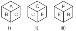 The die has 6 faces which are A, B, C, D, E and F. The different positions of the dice are given below. Which letter will be on the face opposite to D?