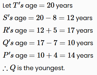 P is 4 years older to Q. Q is 7 years younger to R. R is 5 years older to S. S is 8 years younger to T. Who is the youngest?