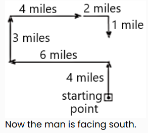 A man starts from a point, walks 4 miles towards the north and turns left and walks 6 miles, turns right and walks for 3 miles and again turns right and walks 4 miles and takes rest for 30 minutes. He gets up and walks straight 2 miles in the same direction and turns right and walks one mile. What is the direction he is facing?