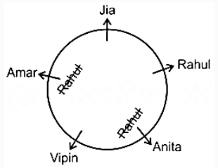 Amar, Anita, Vipin, Jia, and Rahul are sitting around a table facing outwards. Vipin sits second to the left of Jia. Amar is sitting second to the left of Rahul. Rahul does not sit adjacent to Vipin. Which of the following statement is true?