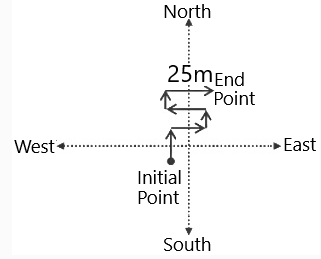 From a shop, Ajay starts walking in the north direction. He takes a right turn, walks and then takes two left turns, walks and then takes two right turns and stops walking after 25 meters. In which direction is he standing with respect to the initial point?