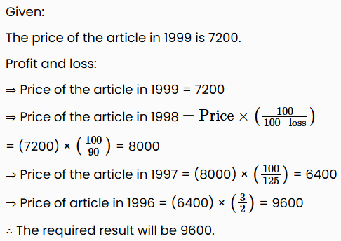 In 1998, the price of an article increased by 25% with respect to that in 1997. In 1999 the price of the article is reduced by 10% with respect to that in 1998 and sold at 7200 rupees then what is the price of the article in 1996 if the price of the article in 1996 and 1997 are in a ratio 3 : 2?