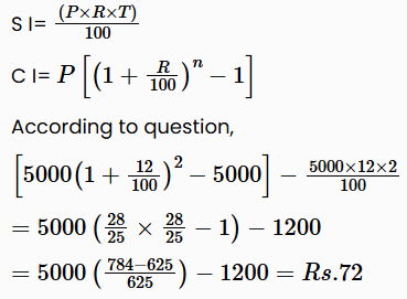 The difference between the simple interest and the compound interest compounded annually at the rate of 12% per annum on Rs.5000 for two years will be: