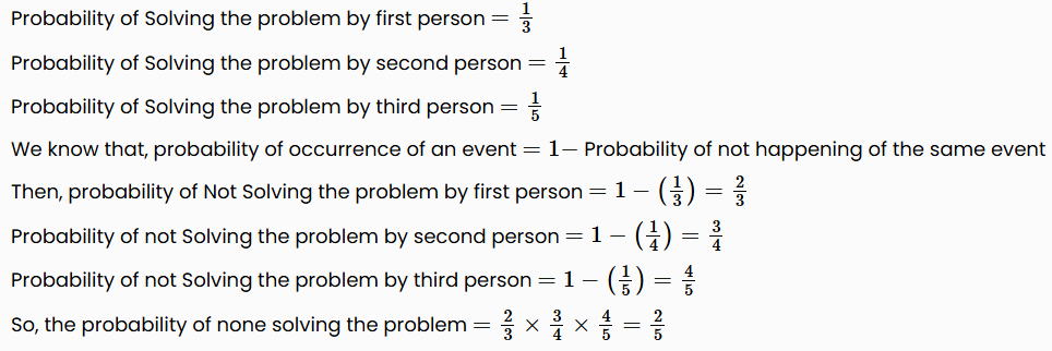 A problem is given to three persons and their chances of solving it are 1/3, 1/4, 1/5 respectively. This probability that none will solve it is: