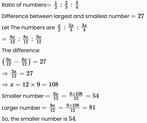 Three numbers are in the ratio 1/2 : 2/3 : 3/4. The difference between the greatest and the smallest number is 27. The smallest number is :