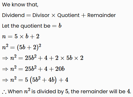 When a number n is divided by 5, the remainder is 2 . When n2 is divided by 5 , the remainder will be:
