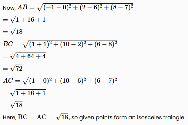 Let, A = (0, 6, 7), B = (-1, 2, 8) and C = (1, 10, 6)