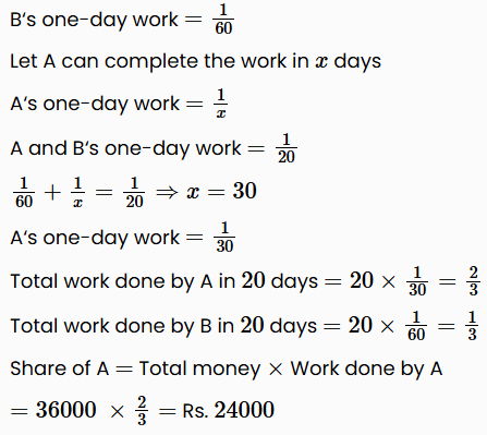 A and B together complete work in 20 days. B alone can complete the same work in 60 days. They took Rs. 36000 to complete the work. What will be the share of A (in Rs.)?