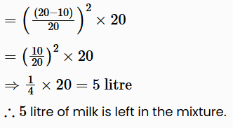 A container has capacity of 20 litres and is full of milk. 10 Litre of milk is taken out of it and replaced by the same quantity of water again 10 litres of mixture is taken out and replaced by an equal quantity of water. How much milk is left in the mixture?