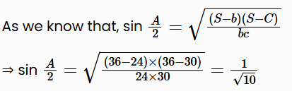 In a ΔABC, if a = 18, b = 24 and c = 30 then find the value of sin (A/2)?