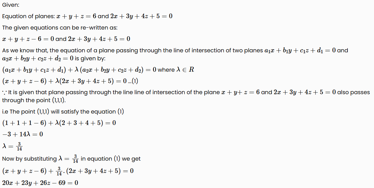 Find the equation of the plane passing through the line of intersection of planes x + y + z = 6 and 2x + 3y + 4z + 5 = 0 and passing through the point (1,1,1).