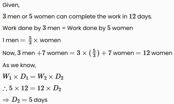 3 men or 5 women can complete the work in 12 days then in how many days 3 men and 7 women will complete the same work?
