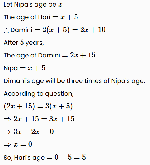 Damini is twice as old as Hari. Hari is 5 years older than Nipa. In 5 years, Damini will be three times as old as Nipa. How old is Hari now?