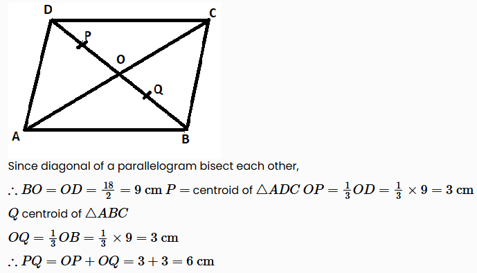 The length of the diagonal BD of the parallelogram ABCD is 18 cm. If P and Q are the centroids of △ADC and △ABC respectively then the length of PO is?