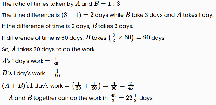 A is thrice as good as a workman as B so A takes 60 days less than B to complete work. In how many times they will do it together.
