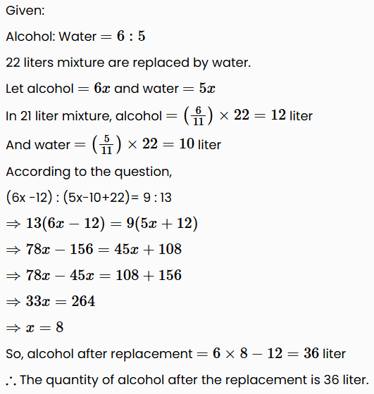 In a mixture, the ratio of alcohol and water is 6 : 5. When 22 liters mixture are replaced by water, the ratio becomes 9 : 13. Find the quantity of alcohol after replacement.