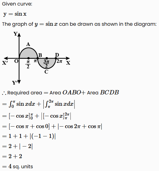 Find the area bounded by the curve \(\mathrm{y}=\sin \mathrm{x}\) between \(\mathrm{x}=0\) and \(\mathrm{x}=2 \pi\).