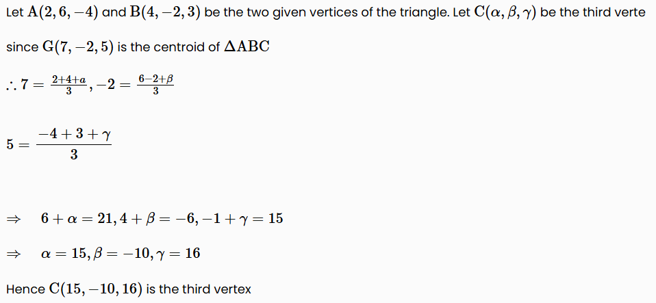 The third vertex of the triangle whose centroid is (7,−2, 5) and whose other two vertices are (2, 6, −4)  and (4,−2, 3)  is-