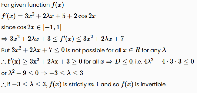 The function f(x) = x3 + λx2 + 5x + sin 2x will be an invertible function if λ belongs to the set -