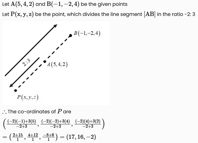 The co-ordinates of the point which divides the line segment joining the points (5,4, 2) and (−1,−2, 4) in the ratio 2 : 3 externally is-