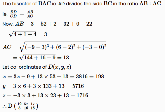 A (3, 2, 0), B (5, 3, 2) and C (-9, 6, -3) are three points forming a triangle and AD is bisector of the angle BAC. AD meets BC at the point :