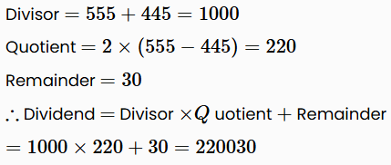A number when divided by the sum of 555 and 445 gives two times their difference as quotient and 30 as remainder. The number is
