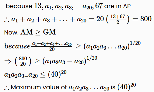 If a1 , a2 , a,....a20 are AMs between 13 and 67, then the maximum value of product  a1 a2 a3 ....a20 is.