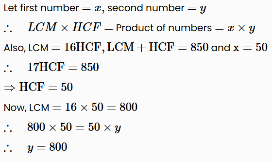 LCM of two numbers is 16 times their HCF. The sum of LCM and HCF is 850. If one number is 50, then what is the other number ?