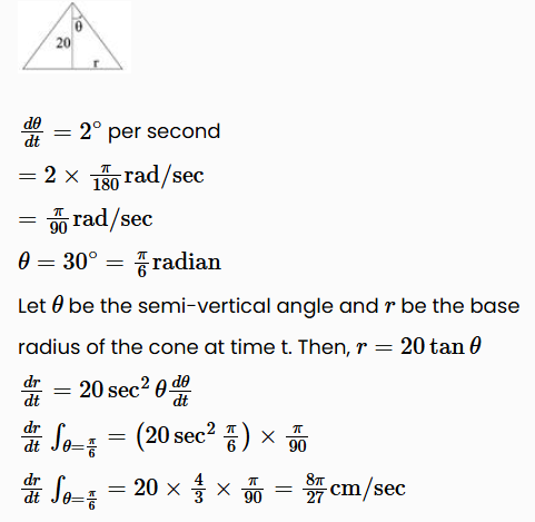 The altitude of a cone is 20cm and its semi-vertical angle is 30°. If the semi-vertical angle is increasing at the rate of 2° per second, then the radius of the base is increasing at the rate of-