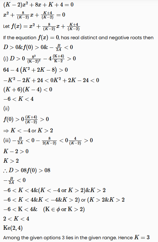 The value of K, for which the equation (K–2)x2 + 8x + K + 4 = 0 has both the roots real distinct and negative is:
