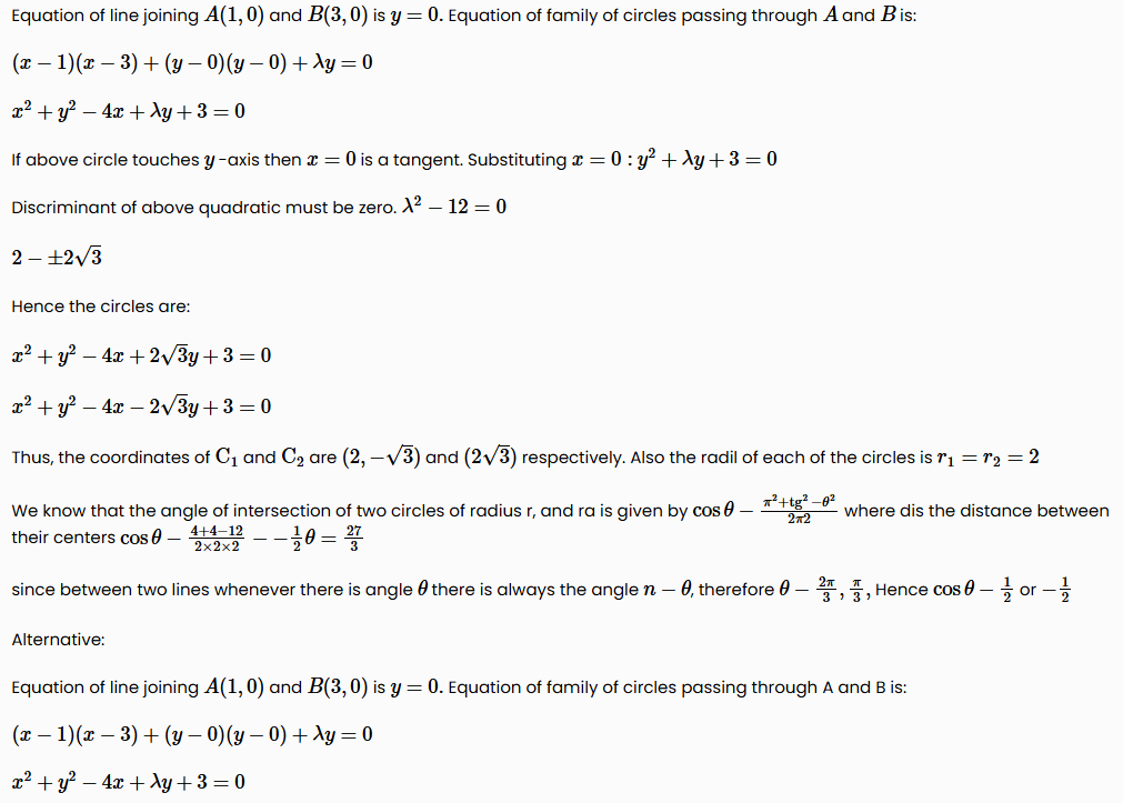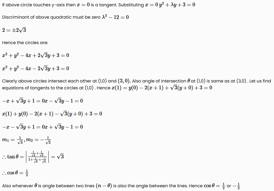The circles which can be drawn to pass through (1,0) & (3,0) and touching the y-axis, intersect at an angle θ. The value of cos θ is equal to