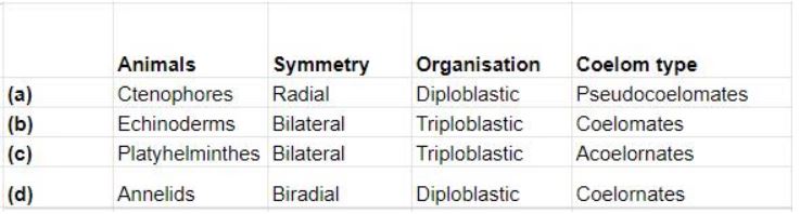 Select the correct matching of animals, their symmetry, organisation and coelom type.