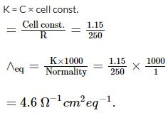 The resistance of 1N solution of acetic acid is 250 ohm, when measured in a cell having a cell constant of 1.15 cm−1. The equivalent conduction (in ohm−1cm2. equiv−1) of 1N acetic acid is ......