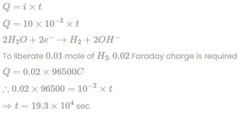 Electrolysis of dilute aqueous NaCl solution was carried out by passing 10 milli ampere current. The time required to liberate 0.01 mol of H2 gas at the cathode is: (1 Faraday = 96500Cmol−1)
