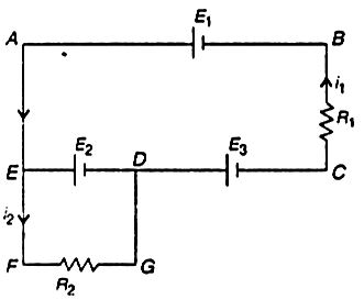The values of the currents i1 and i2 flowing through the resistors R1(= 10Ω) and R2(=30Ω) respectively, in the circuit diagram with E= 3V, E2 = 3V and E= 2V, are: